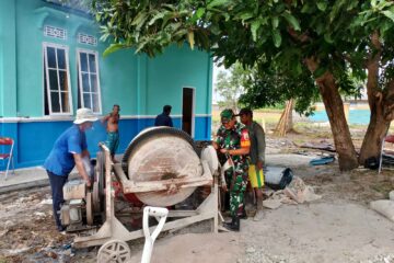 babinsa desa teluk Buton ikut serta dalam mengawasi pelaksanaan kegiatan rehabilitasi gedung pertemuan desa yg menggunakan dana BHP tahun 2023