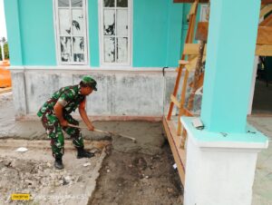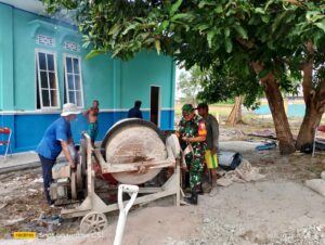 babinsa desa teluk Buton ikut serta dalam mengawasi pelaksanaan kegiatan rehabilitasi gedung pertemuan desa yg menggunakan dana BHP tahun 2023
